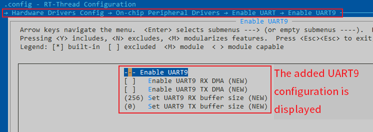 After the modification is complete, open the ENV tool in the BSP directory and enter the 'menuconfig' command on the command line to see if the UART9 configuration has been added.