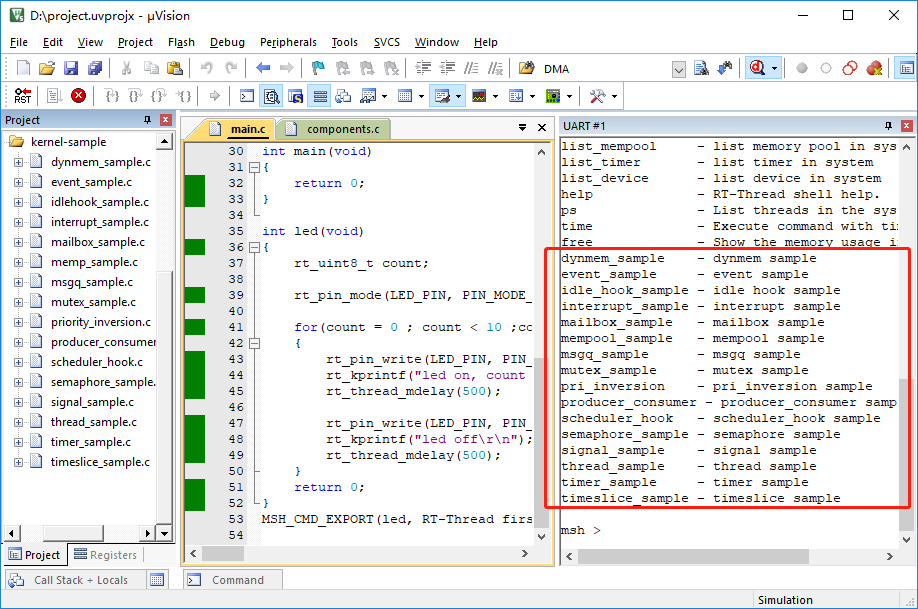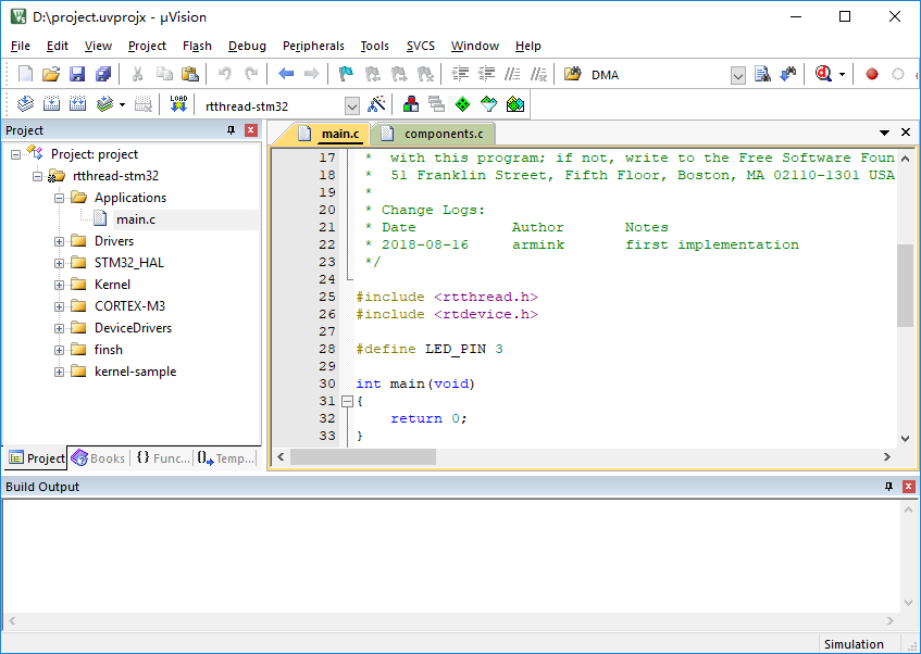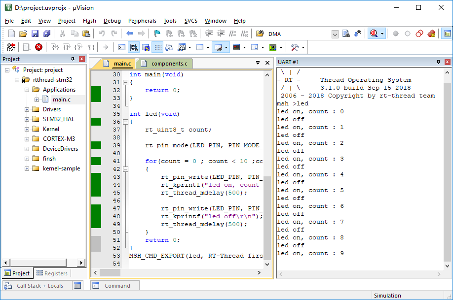 Because of its full STM32F103 software simulation environment, the MDK-ARM integrated development environment gives us the opportunity to run object code directly on the computer without using a real hardware environment . This simulator platform can completely virtualize the various operating modes and peripherals of the ARM Cortex-M3, such as exceptional interrupts, clock timers, serial ports, etc., which is almost identical to the real hardware environment. Practice has also proved that the RT-Thread introductory sample used in this article, after compiling into binary code, can not only run on the simulator platform, but also can run normally on the real hardware platform without modification.