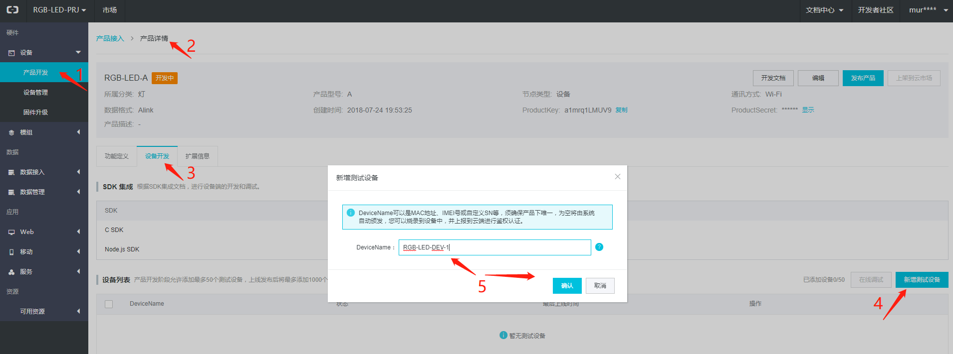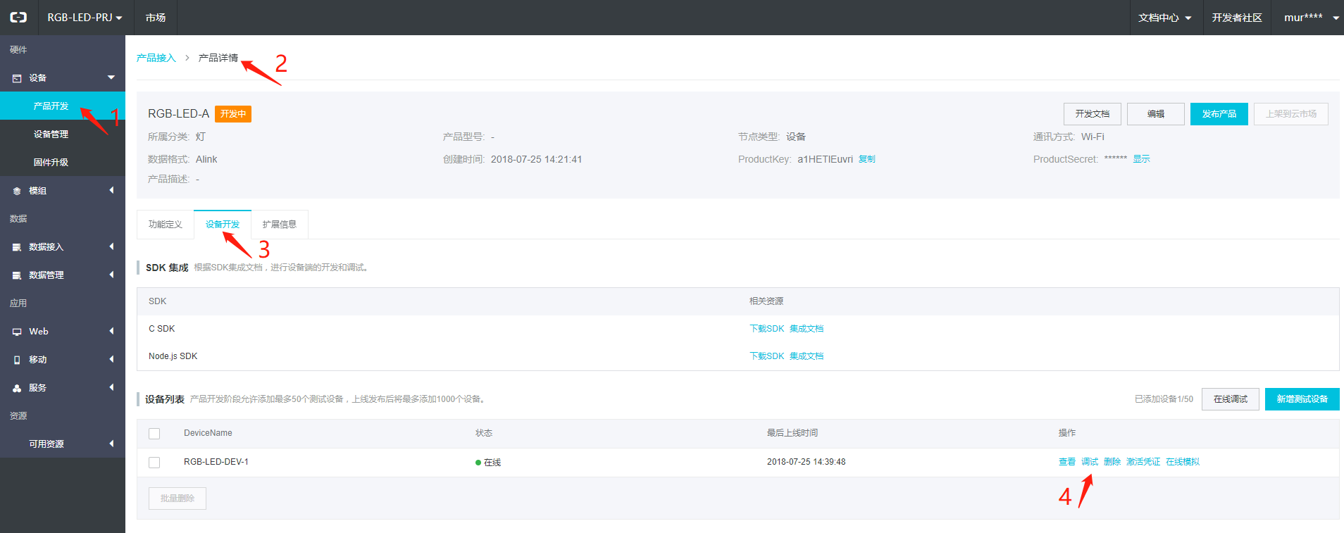 创建产品后,点击查看进入产品详情页面,点击设备开发,新增一个调试设备。