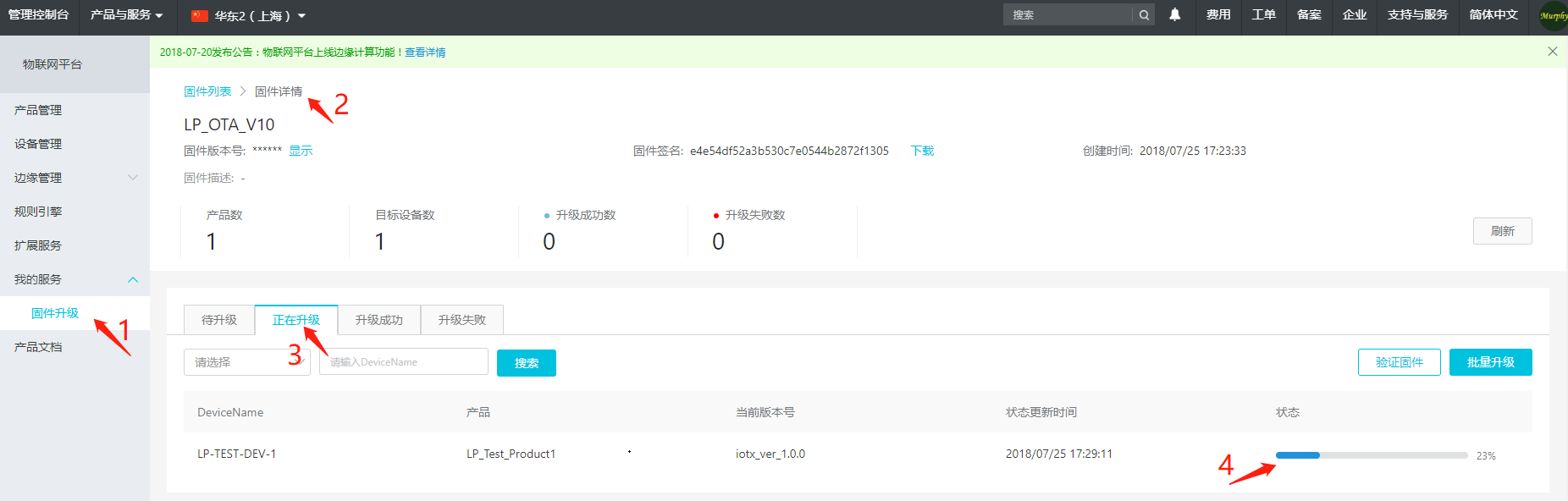 设备升级过程中云端会显示设备下载固件的进度,固件下载完成并校验固件成功,设备 SDK 上报新的版本号到云端,云端会显示升级成功,如下图所示: