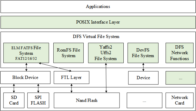 The hierarchical structure of DFS is shown in the following figure, which is mainly divided into POSIX interface layer, virtual file system layer and device abstraction layer.