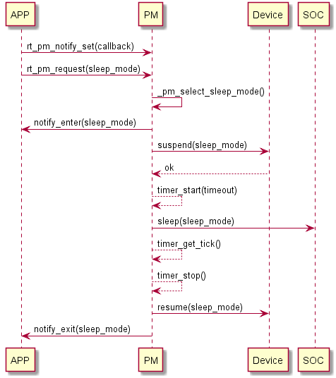 Firstly, the application layer sets the callback function of entering and exiting the dormancy state, and then calls rt_pm_request to request the sleeping mode to trigger the sleeping operation. The PM component checks the number of sleeping modes when the system is idle, and gives the recommended mode according to the number of votes. Then the PM component calls notfiy to inform the application that it is going to enter the sleep mode, and then suspends the registered PM device and executes the sleep mode implemented by SOC after returning to OK. The system enters the sleep state (if the enabling time is compensated, the low-power timer will be started before the sleep). At this point, the CPU stops working and waits for an event or interrupt to wake up. When the system is awakened, because the global interruption is closed, the system continues to execute from there, gets the sleep time to compensate the OS tick of the system, wakes up the device in turn, and notifies the application to exit from the sleep mode. Such a cycle is completed, exits, and waits for the system to be idle next time.